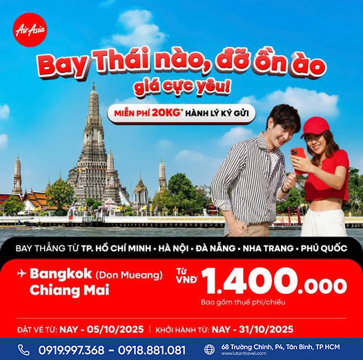 Ưu đãi hành lý miễn phí và giá vé tốt có số lượng giới hạn, đặc biệt là ưu đãi đi Bangkok chỉ mở bán đến 05/10/2025. Hãy liên hệ ngay với Lữ Tấn Travel để săn vé thành công!