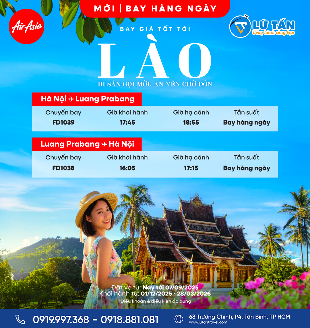 Tin vui cho những ai yêu thích du lịch và khám phá những vùng đất mới! AirAsia chính thức mở bán đường bay thẳng từ Hà Nội đến Luang Prabang (Lào). Giờ đây, bạn có thể dễ dàng đặt chân đến di sản văn hóa thế giới yên bình này với một hành trình nhanh chóng, tiện lợi và tiết kiệm. Với việc khai thác đường bay thẳng hàng ngày, AirAsia cam kết mang đến sự thuận tiện tối đa cho hành khách, giúp bạn có thêm thời gian để tận hưởng vẻ đẹp cổ kính và sự thanh bình của Luang Prabang.