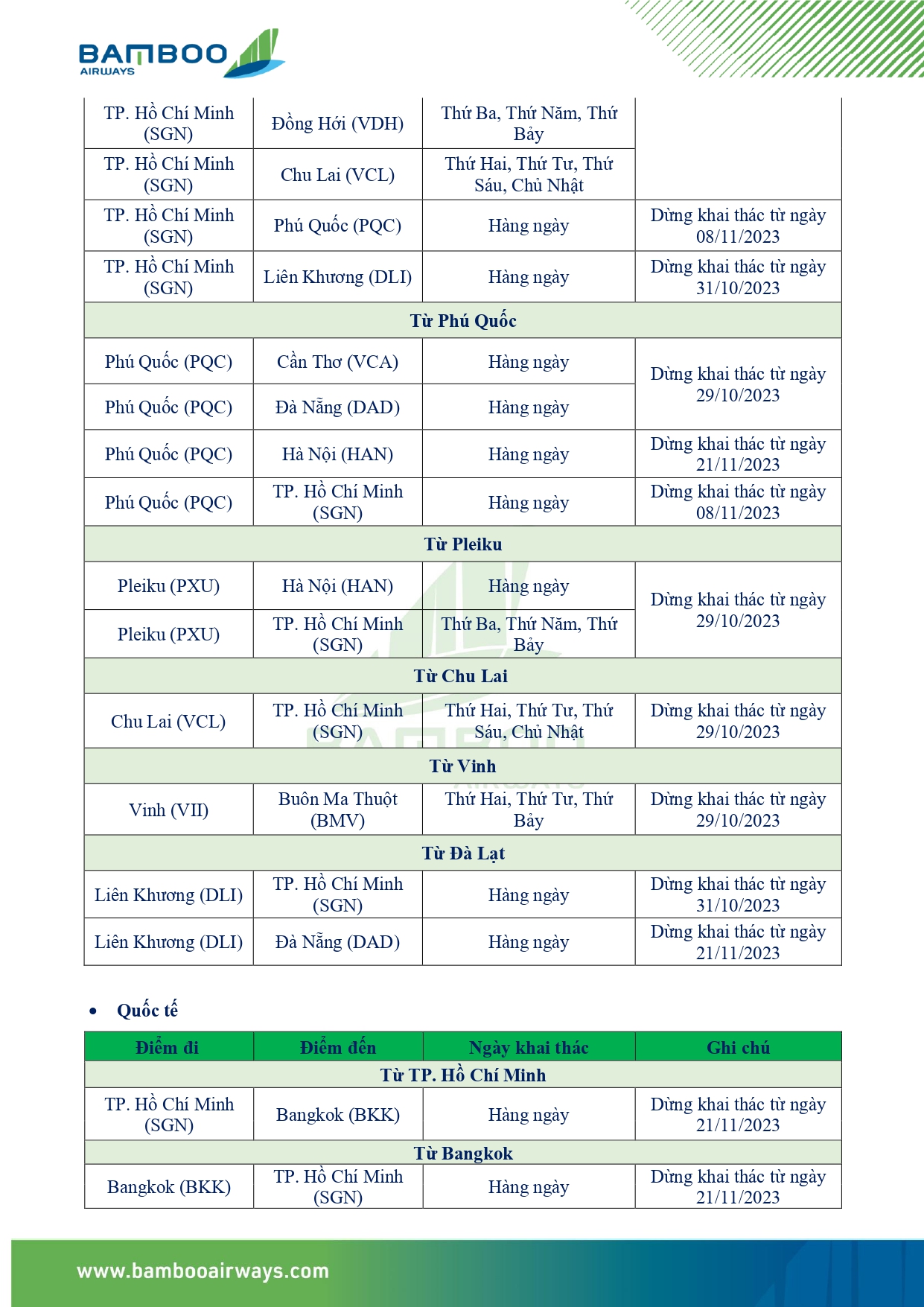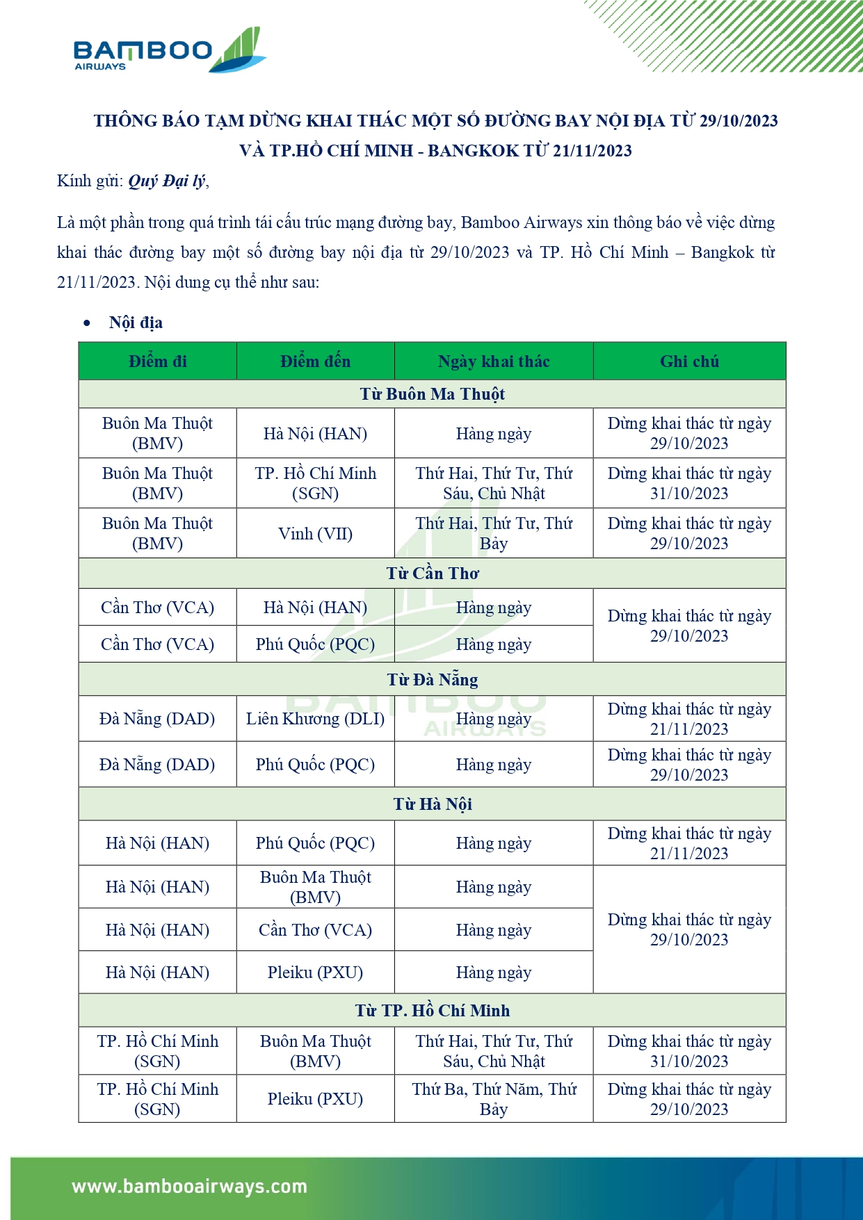 Là một phần trong quá trình tái cấu trúc mạng đường bay, Bamboo Airways xin thông báo về việc dừng khai thác đường bay một số đường bay nội địa từ 29/10/2023 và TP. Hồ Chí Minh – Bangkok từ 21/11/2023. Nội dung cụ thể như sau: