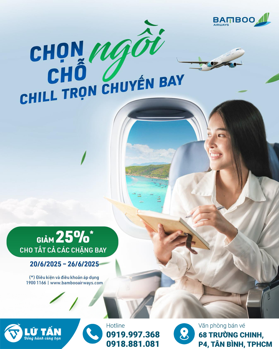 Bamboo Airways mang đến cơ hội thoải mái chọn chỗ ngồi yêu thích với mức giá cực kỳ ưu đãi. Từ ngày 20/6 đến 26/6/2025, hành khách khi đặt vé qua Lữ Tấn Travel – đại lý chính thức của Bamboo Airways, sẽ được giảm ngay 25% phí chọn ghế trên toàn hệ thống chuyến bay.