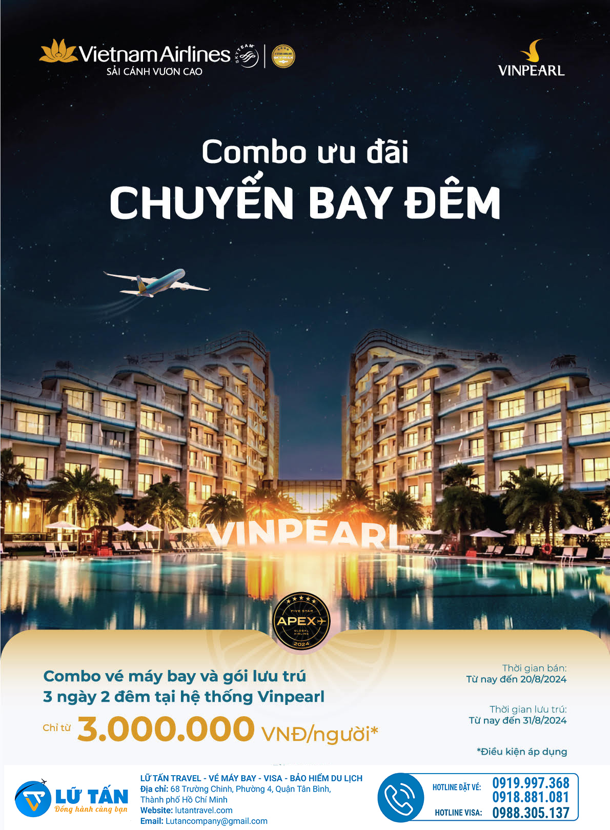 Lữ Tấn travel thường xuyên cập nhật thông tin giá vé và các ưu đãi giúp hành khách có thể dễ dàng chọn được hành trình bay phù hợp. Với nhiều năm kinh nghiệm cung cấp vé máy bay giá rẻ, đội ngũ tư vấn chuyên nghiệp, Lữ Tấn Travel tự tin khi đồng hành cùng bạn trong hành trình Nội địa và Quốc Tế. Liên hệ hotline 0919.997.368 - 0918.881.081 ngay hôm nay để các booker hướng dẫn và hỗ trợ bạn săn vé máy bay sớm nhất nhé!