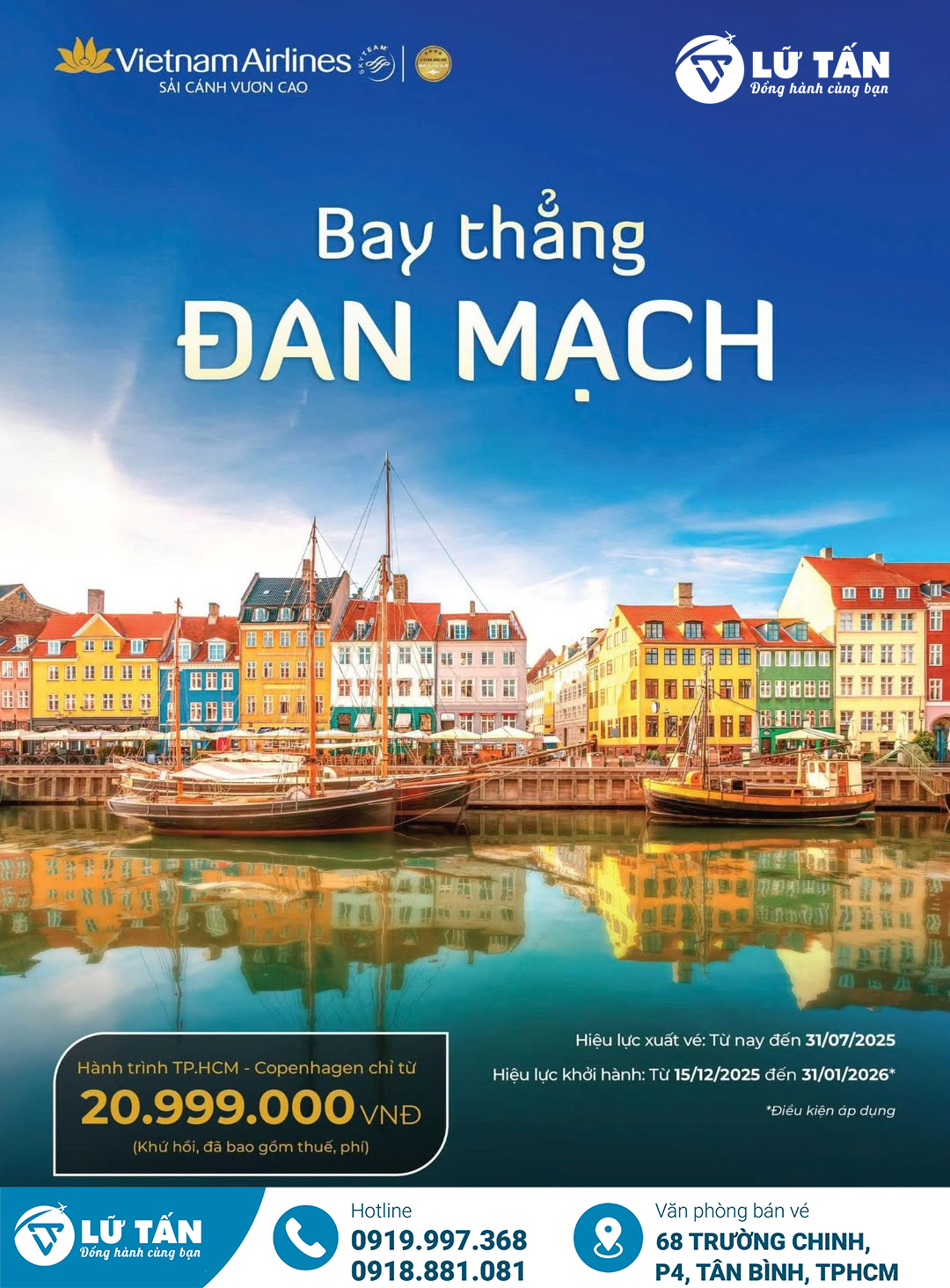 Lữ Tấn Travel – đại lý chính thức của Vietnam Airlines – hân hạnh đồng hành cùng bạn trên hành trình đến Đan Mạch và châu Âu mùa đông này. Đặt vé sớm để giữ chỗ đẹp và hưởng trọn ưu đãi bay thẳng không quá cảnh – trải nghiệm cao cấp, giá cực tốt!
