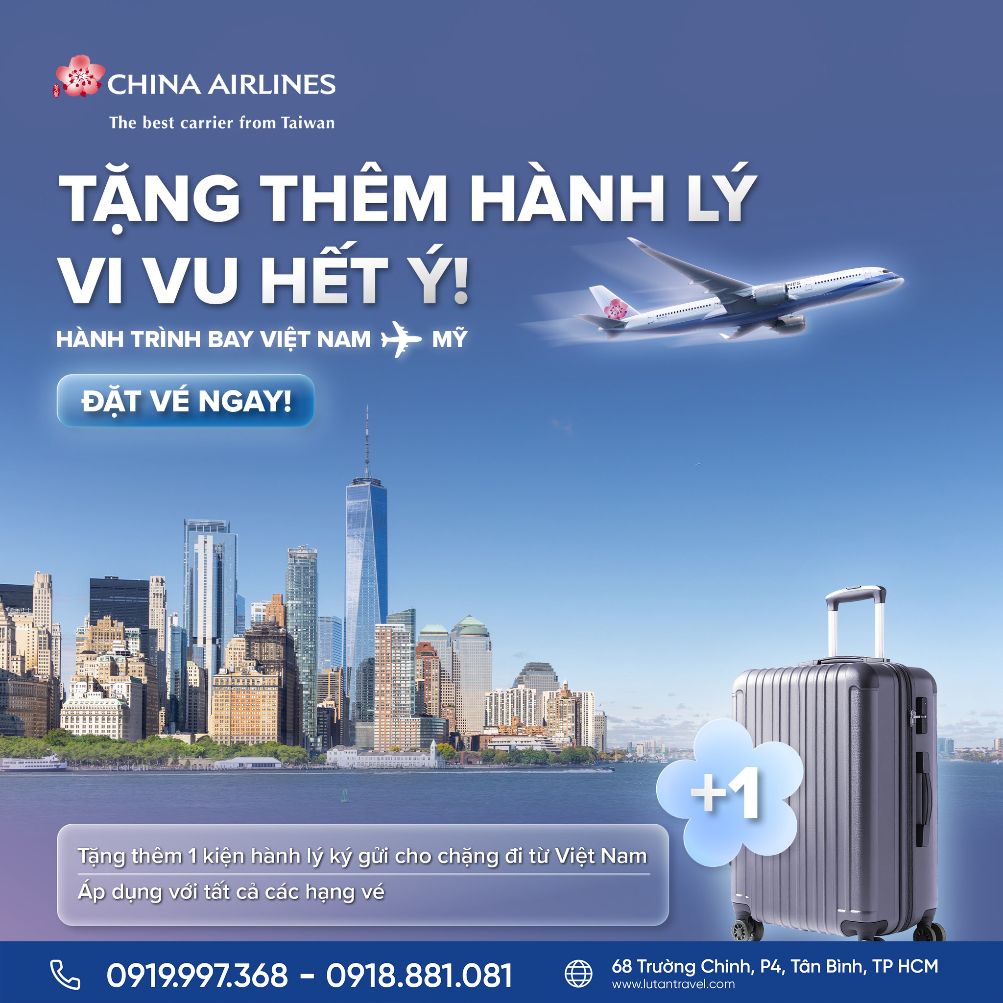 China Airlines mang đến chương trình ưu đãi đặc biệt: TẶNG THÊM 1 KIỆN HÀNH LÝ KÝ GỬI cho hành trình từ Việt Nam đến Mỹ. Đây là cơ hội tuyệt vời để bạn mang theo tất cả những vật dụng cần thiết cho chuyến đi dài ngày, hoặc thoải mái mua sắm quà lưu niệm mà không phải lo nghĩ.