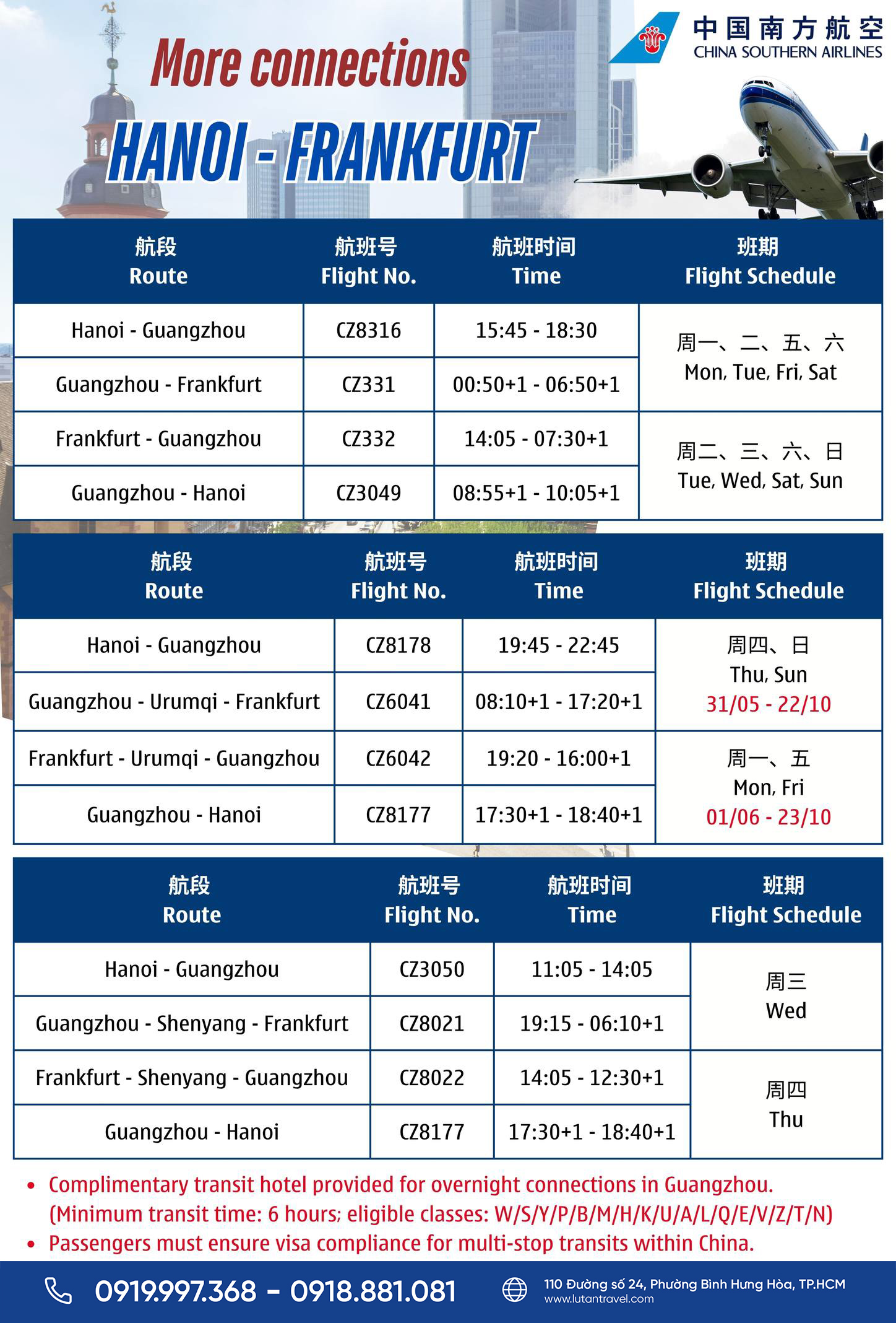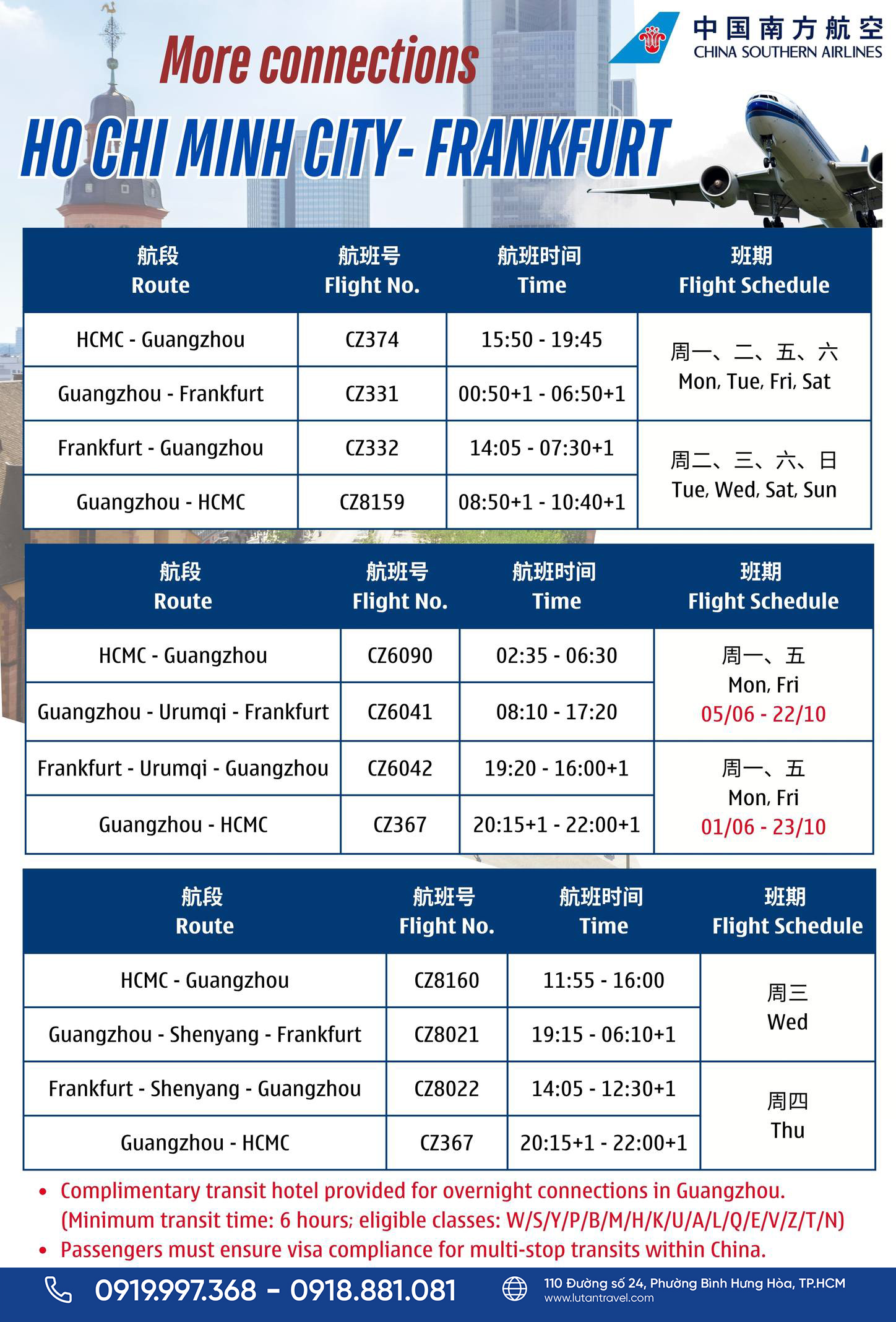 Nối chuyến mượt mà: Lịch bay được thiết kế tối ưu giữa các chặng từ Việt Nam đến Quảng Châu và từ Quảng Châu đi Frankfurt, rút ngắn thời gian chờ đợi.