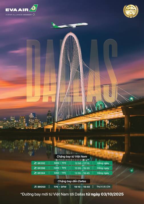 EVA Air chính thức khai thác đường bay mới từ Việt Nam đến Dallas (DFW), Hoa Kỳ kể từ ngày 03/10/2025 – đánh dấu cột mốc quan trọng trong hành trình mở rộng mạng lưới quốc tế của hãng hàng không 5 sao này.