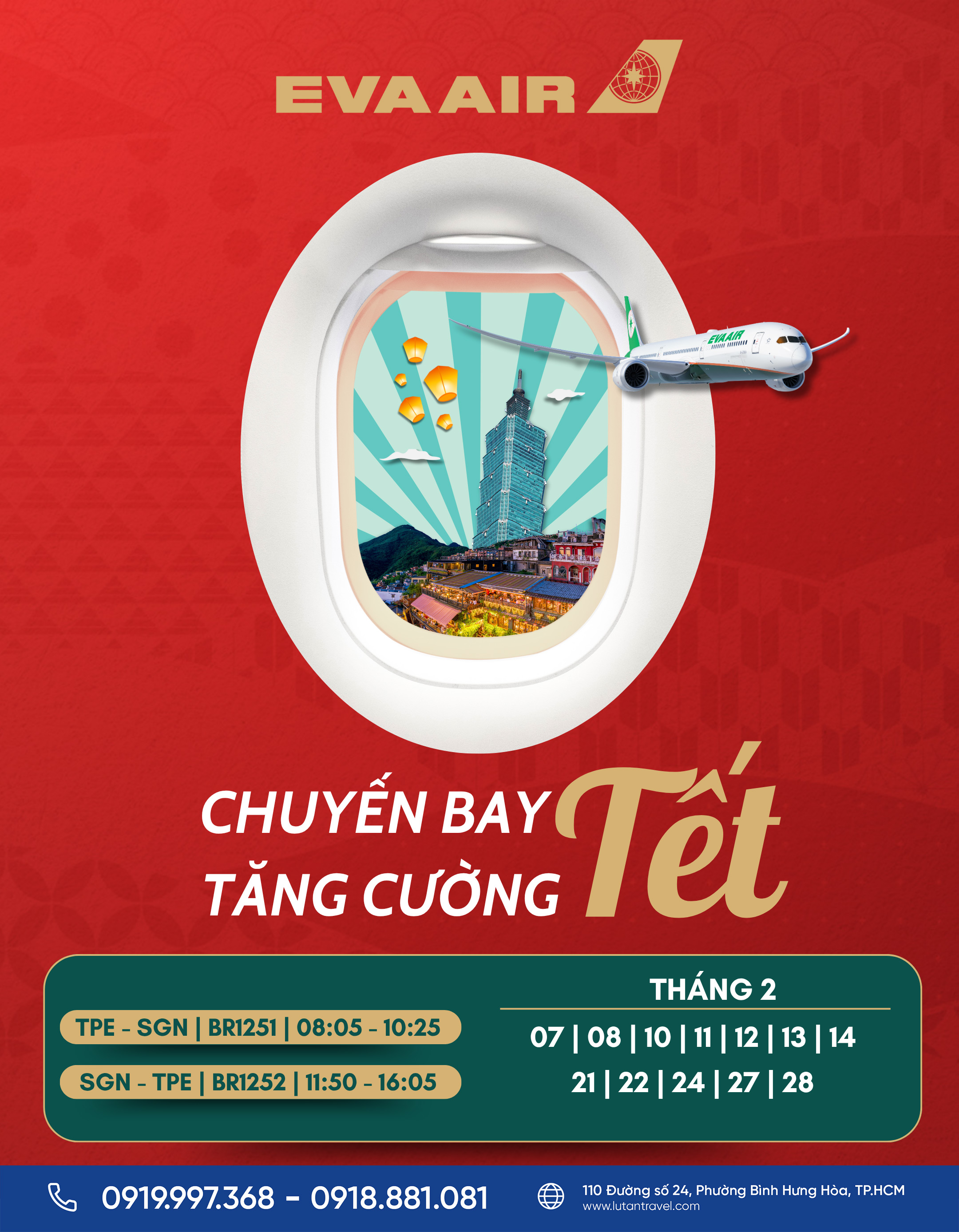 Vé máy bay Tết luôn hết rất nhanh. Hãy liên hệ ngay với Lữ Tấn Travel để đặt vé EVA Air, chọn lịch bay phù hợp và khởi đầu năm mới trọn vẹn!