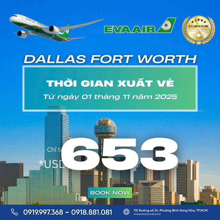 Ưu đãi giá vé đi Dallas Fort Worth (DFW) có hiệu lực từ 01/11/2025. Hãy liên hệ ngay với Lữ Tấn Travel để săn mức giá tốt nhất và trải nghiệm hành trình đẳng cấp 5 sao cùng EVA Air!