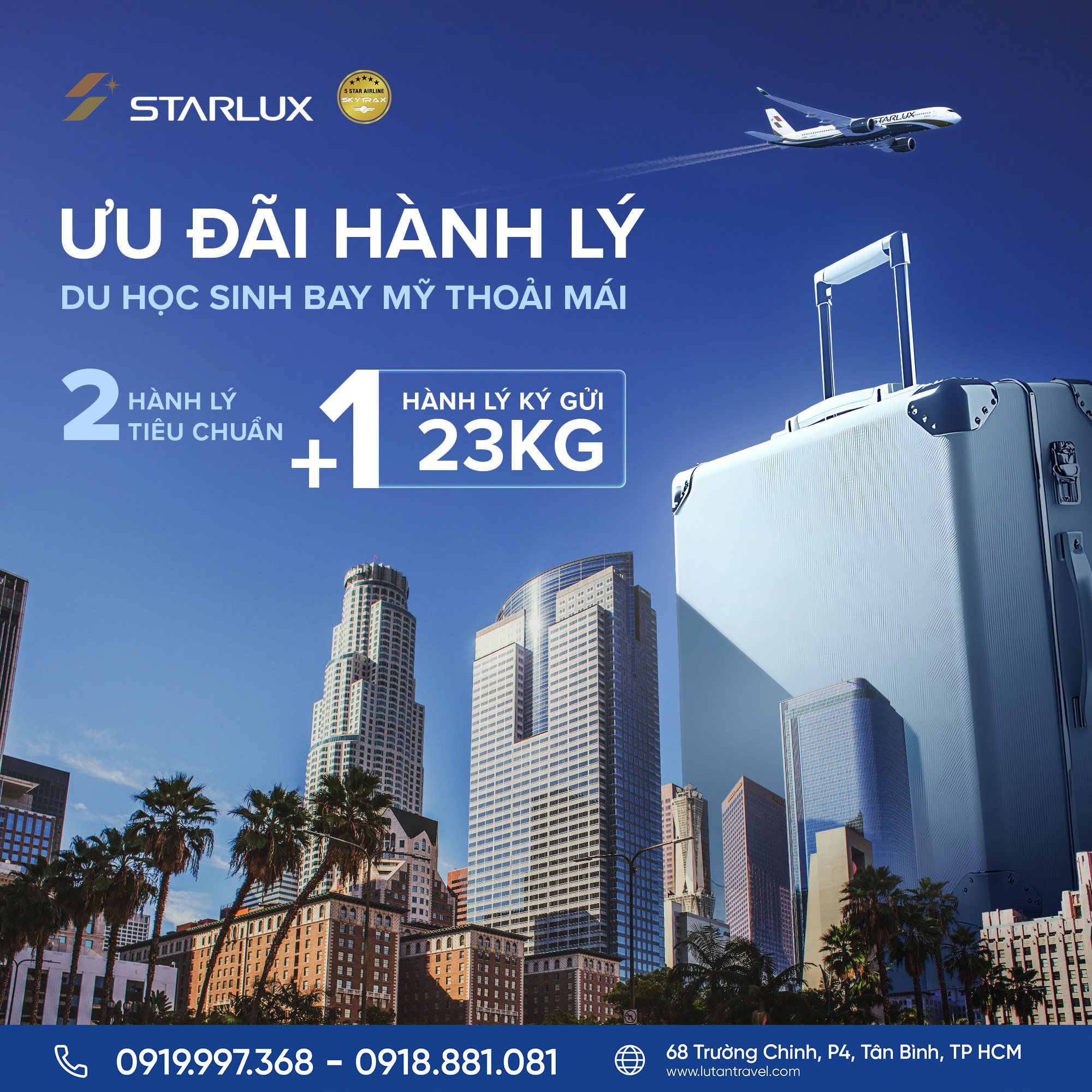Ưu đãi hành lý du học sinh có thời hạn. Hãy liên hệ ngay với Lữ Tấn Travel – Đại lý chính thức của STARLUX Airlines để được tư vấn chính xác về điều kiện áp dụng và đặt vé giá tốt nhất.
