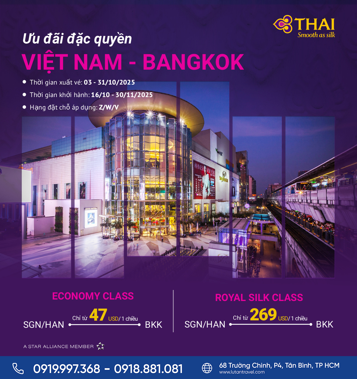 Ưu đãi bay Bangkok của Thai Airways chỉ áp dụng trong thời gian ngắn. Hãy liên hệ ngay với Lữ Tấn Travel để săn vé giá tốt nhất và tận hưởng dịch vụ bay “Smooth as Silk”!