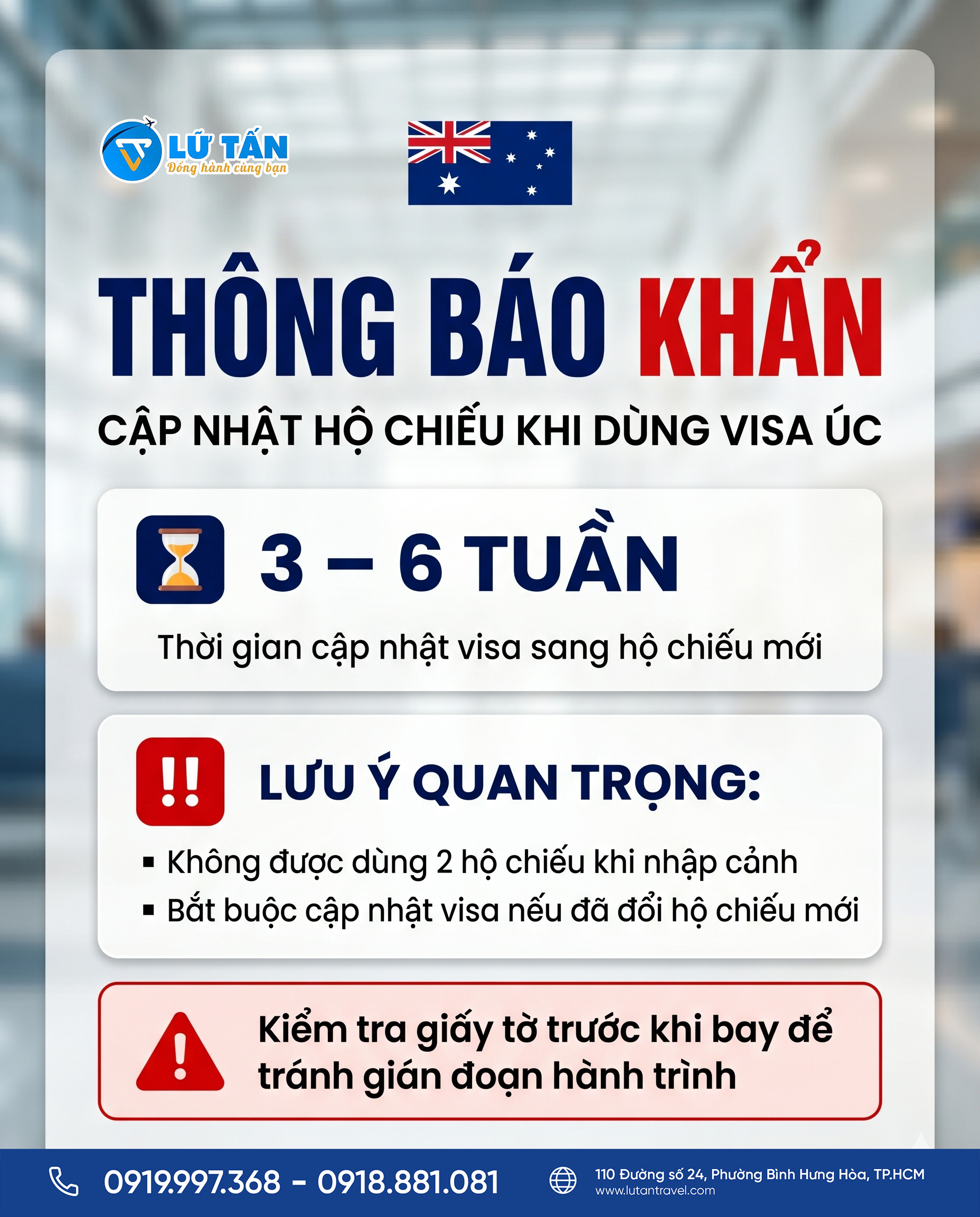 Lãnh sự quán Úc vừa ban hành thông báo quan trọng liên quan đến việc thay đổi thông tin hộ chiếu dành cho hành khách đã có visa. Đây là thông tin cực kỳ quan trọng, có thể ảnh hưởng trực tiếp đến khả năng khởi hành của quý khách nếu không được xử lý kịp thời.