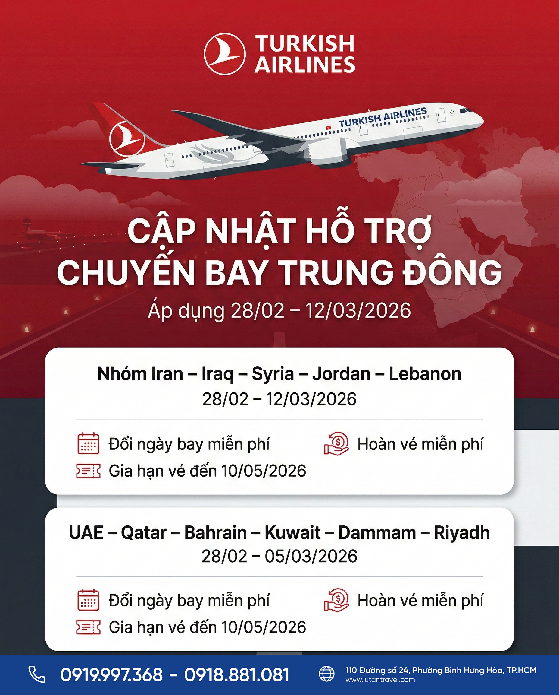 Trước tình hình bất ổn đang diễn ra tại khu vực Trung Đông, hãng hàng không quốc gia Thổ Nhĩ Kỳ – Turkish Airlines đã nhanh chóng triển khai chính sách hỗ trợ đặc biệt nhằm bảo vệ quyền lợi và đảm bảo an toàn cho hành khách. Chính sách này áp dụng cho các hành trình đi và đến các quốc gia trong khu vực bị ảnh hưởng, giúp hành khách chủ động thay đổi kế hoạch di chuyển một cách linh hoạt nhất.