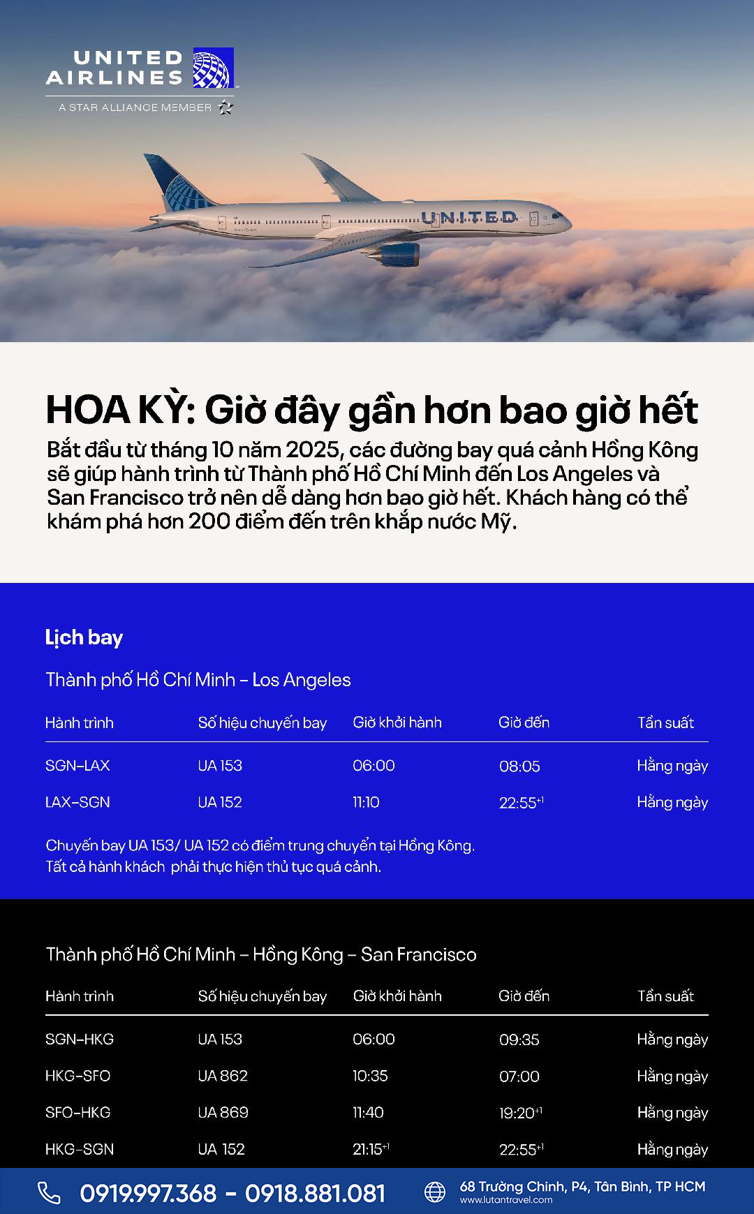 Việc mở đường bay mới từ Việt Nam đến Hoa Kỳ của United Airlines là một cơ hội tuyệt vời để bạn hiện thực hóa giấc mơ Mỹ của mình. Để đảm bảo có được vé với giá tốt nhất và nhận được sự tư vấn chuyên nghiệp, hãy liên hệ ngay với Lữ Tấn Travel – đại lý chính thức của United Airlines. Chúng tôi sẽ giúp bạn giữ chỗ siêu tốc và hỗ trợ mọi thông tin cần thiết.