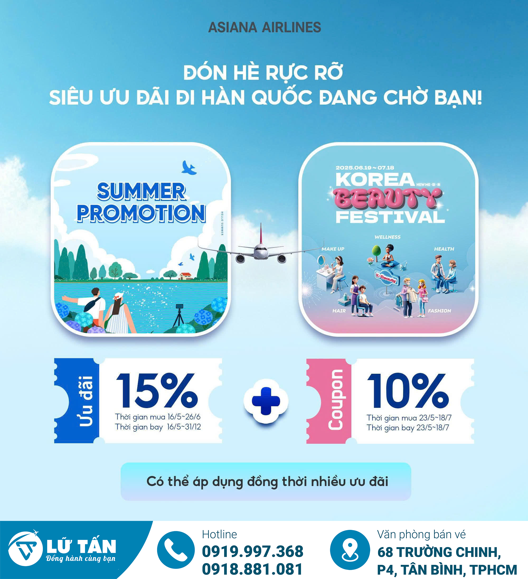 Nếu bạn đang có kế hoạch đến Hàn Quốc trong mùa hè năm nay, đây chính là thời điểm lý tưởng để đặt vé. Asiana Airlines – một trong những hãng hàng không hàng đầu Hàn Quốc – mang đến chương trình ưu đãi kép đặc biệt cho hành khách khởi hành từ Việt Nam đi Seoul (Incheon) với mức giảm lên đến 25%.