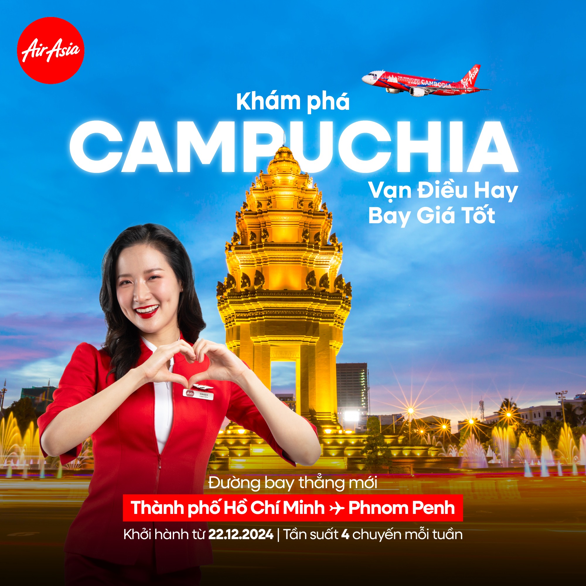 AirAsia vừa chính thức mở bán vé 0 đồng cho đường bay thẳng từ TP.HCM đến Phnom Penh, mang đến cơ hội tuyệt vời để khám phá Campuchia với chi phí cực kỳ tiết kiệm. Hành trình này không chỉ giúp bạn tiết kiệm chi phí mà còn mở ra cơ hội trải nghiệm một quốc gia với văn hóa độc đáo, ẩm thực phong phú và cảnh sắc thiên nhiên ấn tượng. Với mức giá vé hấp dẫn chỉ từ 1.106.000 VND/chiều (đã bao gồm thuế và phí), đây chắc chắn là ưu đãi không thể bỏ qua cho những tín đồ du lịch.