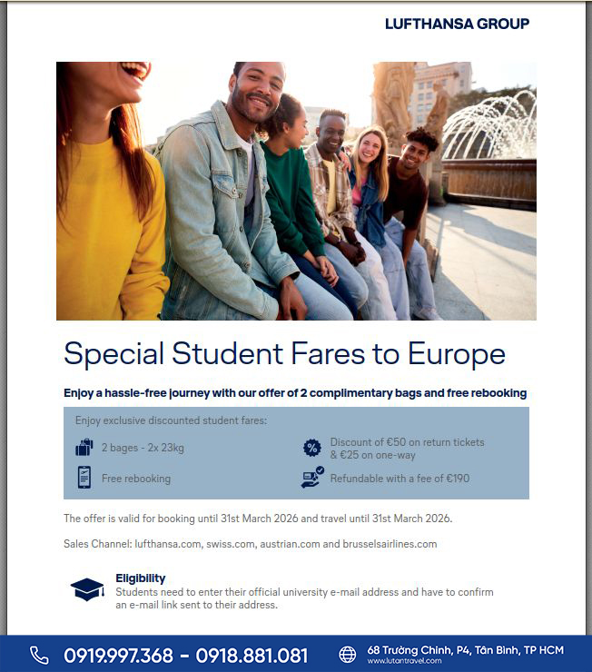 Để nhận được các ưu đãi trên và đảm bảo hành trình suôn sẻ, hãy liên hệ ngay với Lữ Tấn Travel – đại lý chính thức của các hãng hàng không. Chúng tôi cam kết mang đến giá vé ưu đãi nhất, dịch vụ tư vấn tận tâm và hỗ trợ nhanh chóng cho du học sinh và phụ huynh.