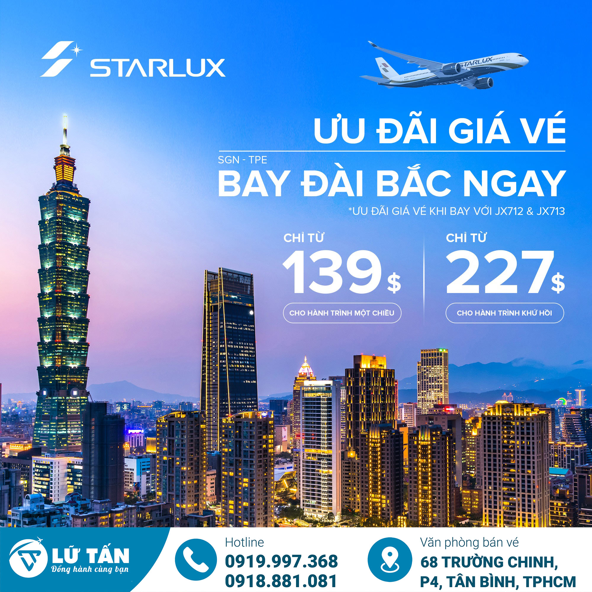 Bạn đang lên kế hoạch khám phá Đài Bắc – thủ phủ sôi động của Đài Loan? Đây chính là thời điểm hoàn hảo để bạn thực hiện chuyến đi với mức giá không thể hấp dẫn hơn cùng STARLUX Airlines, hãng hàng không cao cấp đến từ Đài Loan. Chuyến bay TP.HCM ↔ Đài Bắc chưa bao giờ dễ dàng và “sang trọng” đến thế!