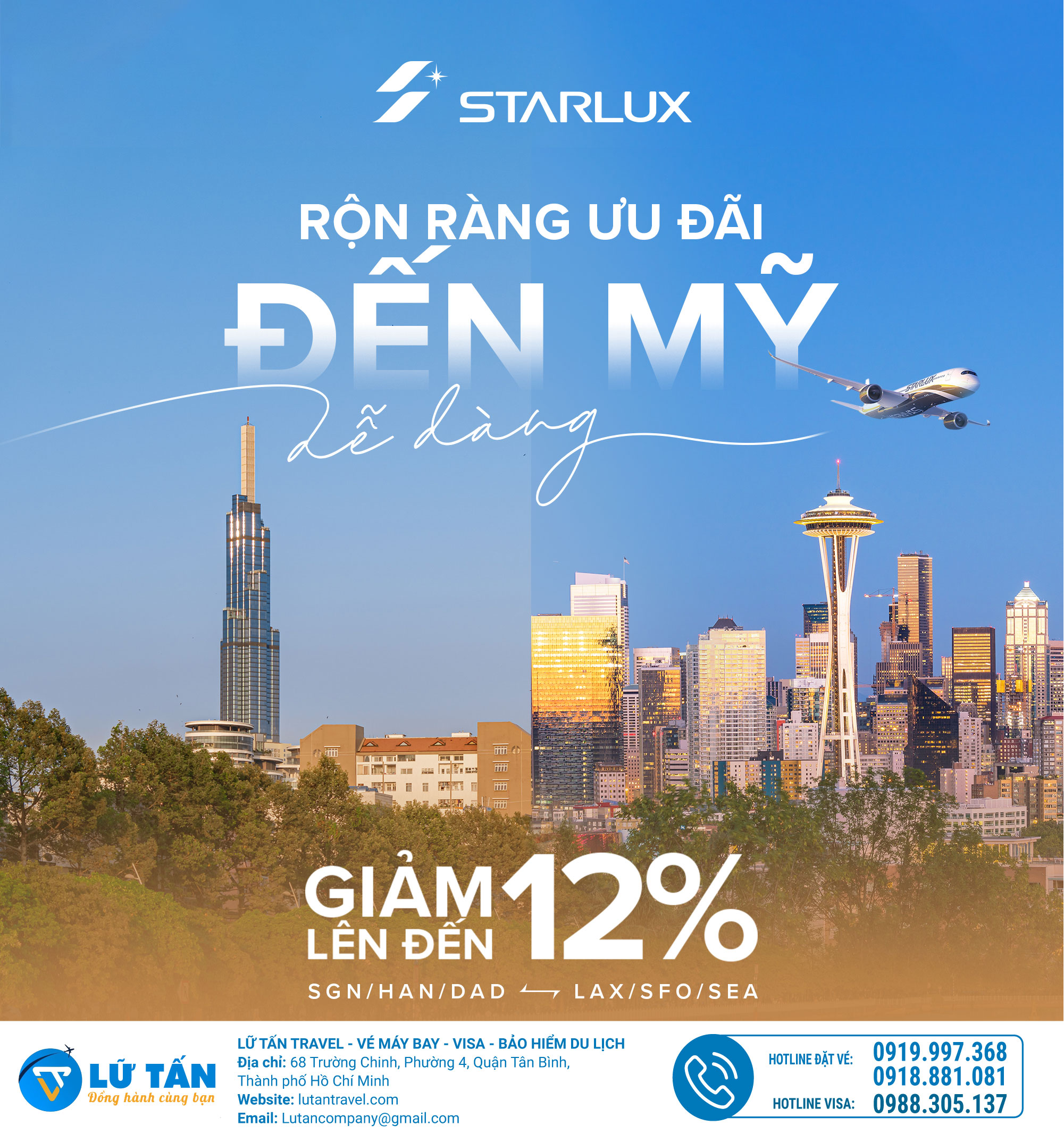 Bạn ơi, Xứ sở Cờ hoa đang vẫy gọi với vẻ đẹp tráng lệ của những công trình nguy nga và vô vàn tuyệt tác từ thiên nhiên hùng vĩ! Với ưu đãi lên đến 12%, bạn có thể cùng STARLUX tận hưởng hành trình bay thư thái, đẳng cấp từ Việt Nam đến Mỹ ngay hôm nay.