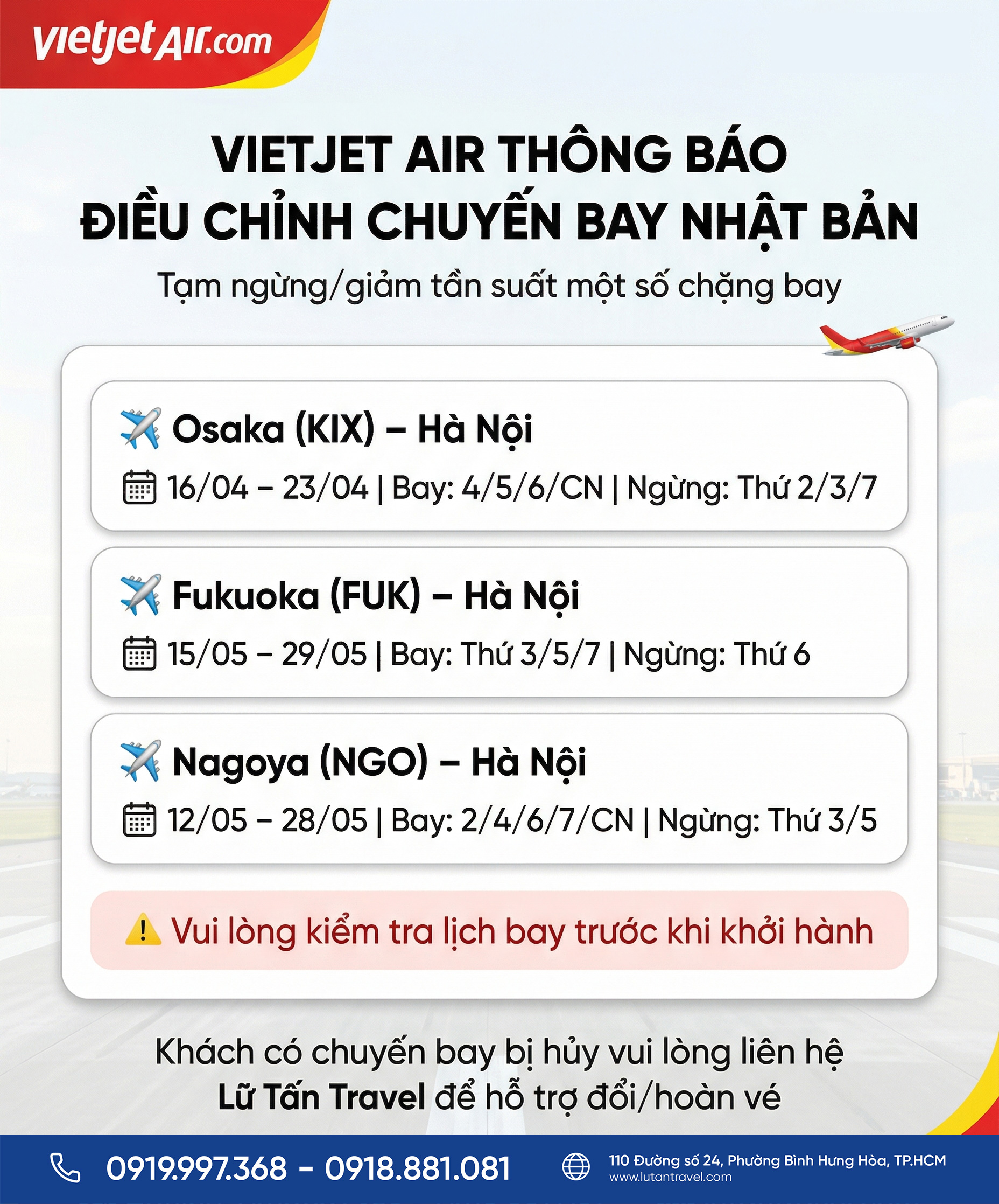Thông Báo: Vietjet Air Điều Chỉnh Tần Suất Các Chuyến Bay Đi Nhật Bản