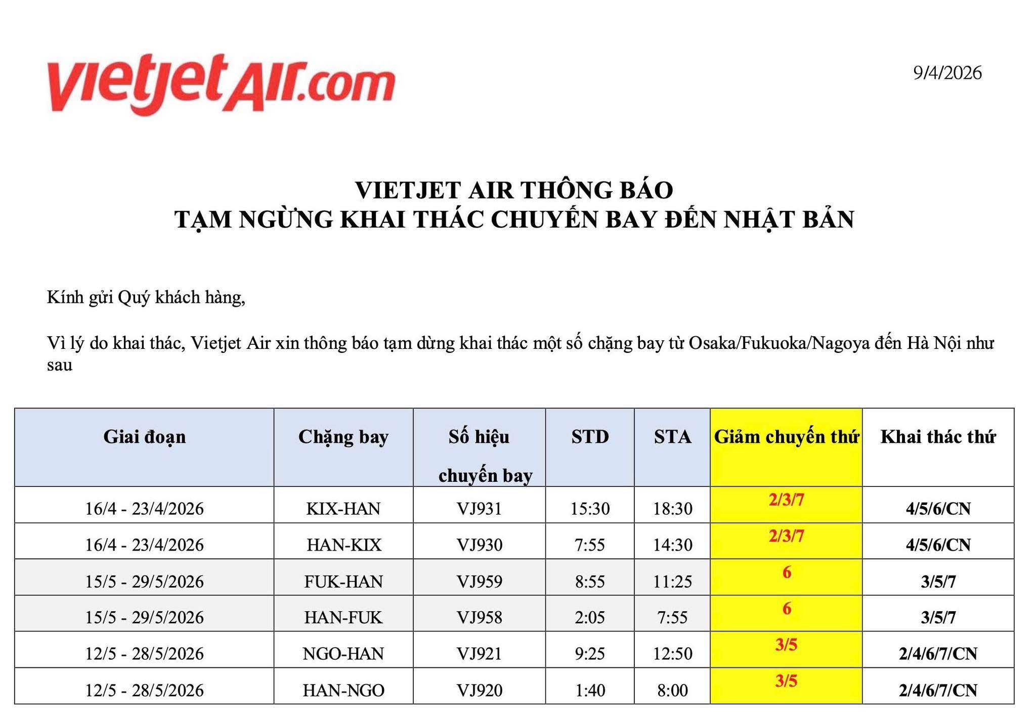 Nhằm mục đích tối ưu hóa hoạt động khai thác và điều chỉnh nguồn lực trong giai đoạn cao điểm mùa xuân hè 2026, hãng hàng không thế hệ mới Vietjet Air chính thức thông báo về việc thay đổi lịch trình các chuyến bay kết nối giữa Việt Nam và Nhật Bản. Cụ thể, một số hành trình từ Hà Nội đi các thành phố lớn tại xứ sở Phù Tang sẽ có sự thay đổi về tần suất hoặc tạm ngừng khai thác trong thời gian tới.