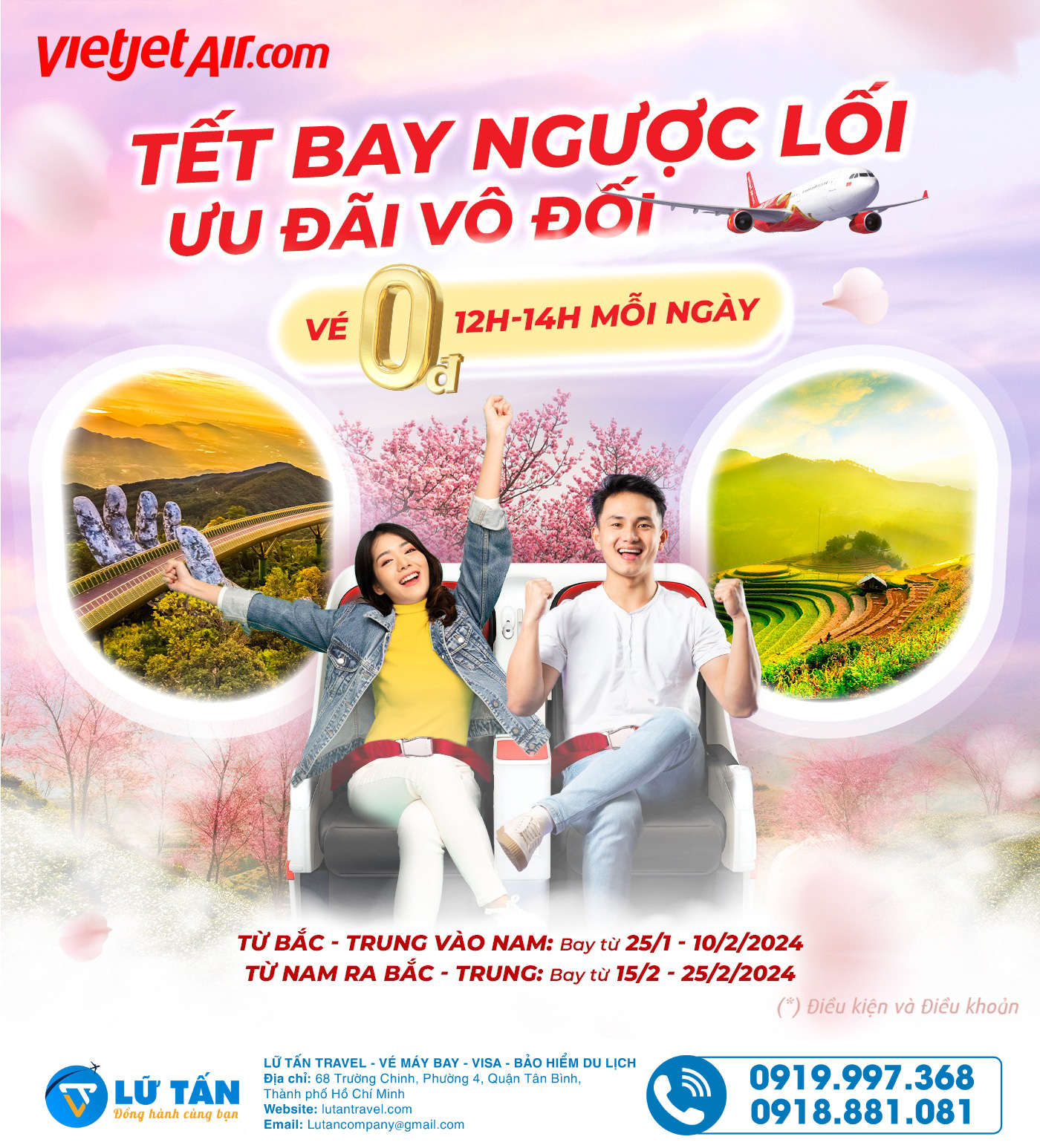 Lữ Tấn travel thường xuyên cập nhật thông tin giá vé và các ưu đãi giúp hành khách có thể dễ dàng chọn được hành trình bay phù hợp. Với nhiều năm kinh nghiệm cung cấp vé máy bay giá rẻ, đội ngũ tư vấn chuyên nghiệp, Lữ Tấn Travel tự tin khi đồng hành cùng bạn trong hành trình Nội địa và Quốc Tế. Liên hệ hotline 0919.997.368 - 0918.881.081 ngay hôm nay để các booker hướng dẫn và hỗ trợ bạn săn vé máy bay sớm nhất nhé!