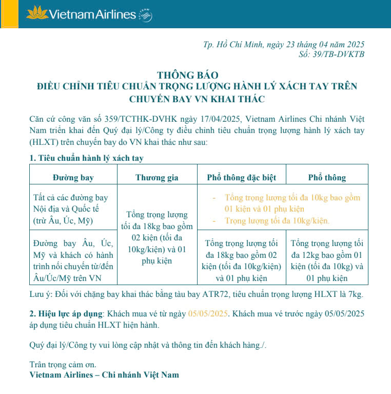 📣 THÔNG BÁO MỚI TỪ VIETNAM AIRLINES – ĐIỀU CHỈNH QUY ĐỊNH HÀNH LÝ XÁCH TAY