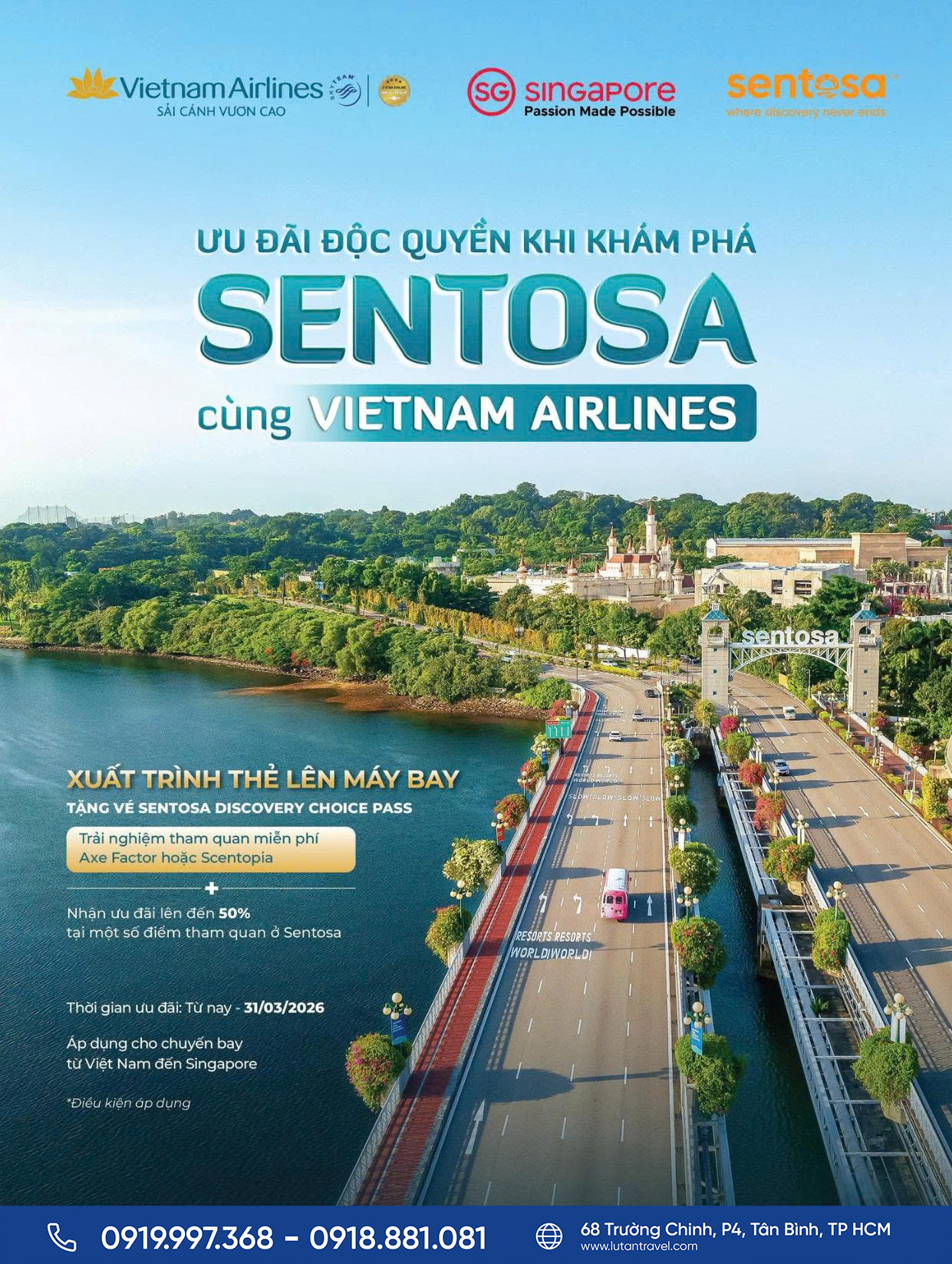 Đây là cơ hội vàng để bạn khám phá những điểm tham quan hàng đầu thế giới của Sentosa, từ các khu vui chơi mạo hiểm đến những trải nghiệm thư giãn đẳng cấp. Chương trình áp dụng linh hoạt cho các chuyến bay từ Việt Nam đến Singapore cùng Vietnam Airlines, với thời gian hiệu lực kéo dài đến 31/03/2026.