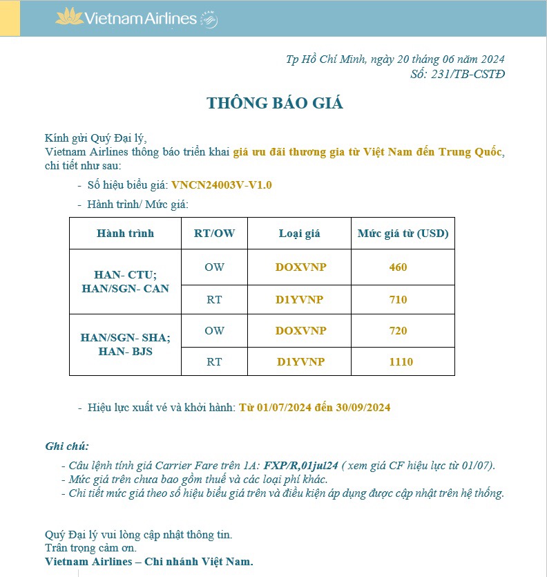 Vietnam Airlines thông báo triển khai chương trình “Ưu đãi Thương gia khởi hành từ Việt Nam đi Trung Quốc” chi tiết như sau: