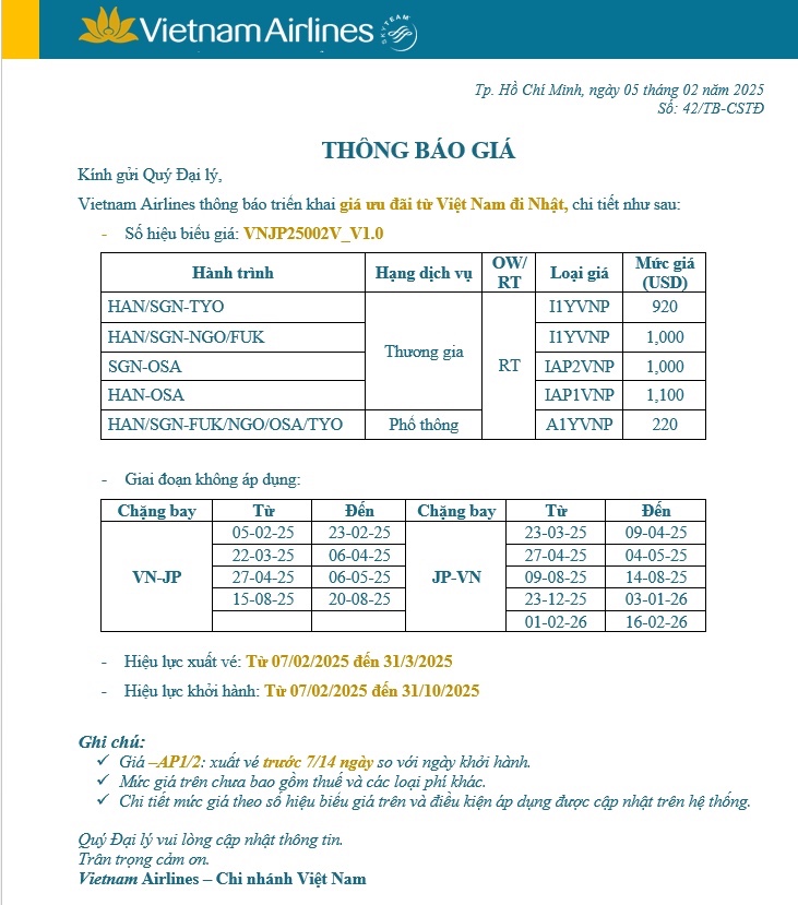 Vietnam Airlines, hãng hàng không quốc gia Việt Nam, vừa công bố chương trình giá vé ưu đãi đặc biệt dành cho các chuyến bay từ Việt Nam đi Nhật Bản. Đây là cơ hội tuyệt vời để hành khách có thể trải nghiệm dịch vụ hàng không đẳng cấp với mức giá hấp dẫn. Chi tiết về chương trình như sau: