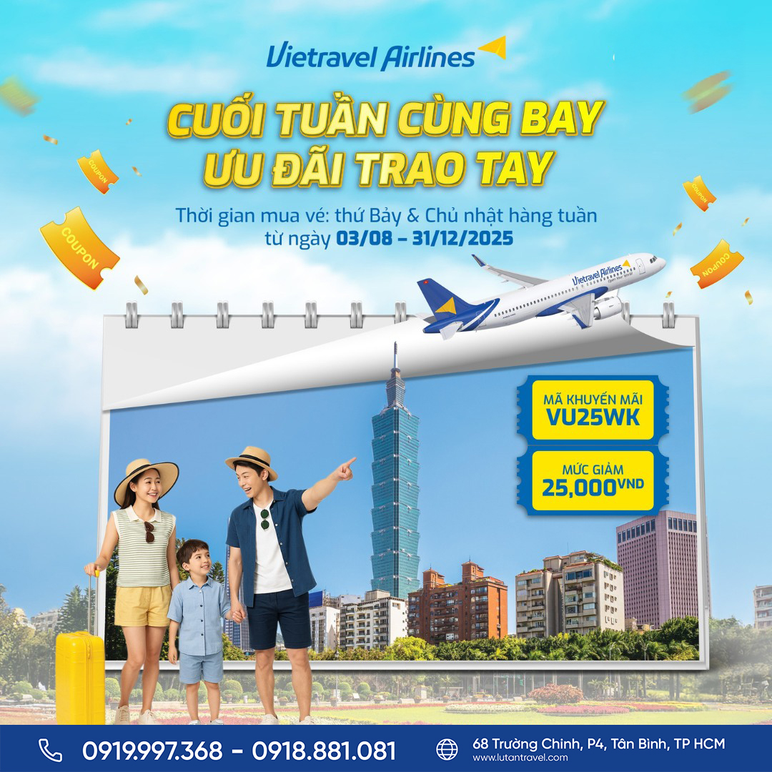 Bạn có muốn biến những chuyến đi cuối tuần thành một trải nghiệm đáng nhớ? Vietravel Airlines mang đến chương trình ưu đãi đặc biệt, giúp bạn tiết kiệm chi phí cho mỗi hành trình. Chỉ cần đặt vé vào Thứ Bảy hoặc Chủ Nhật, bạn sẽ được giảm ngay 25.000 VNĐ cho mỗi khách, mỗi chặng. Đây là cơ hội tuyệt vời để bạn khám phá những điểm đến mới với chi phí tiết kiệm hơn.
