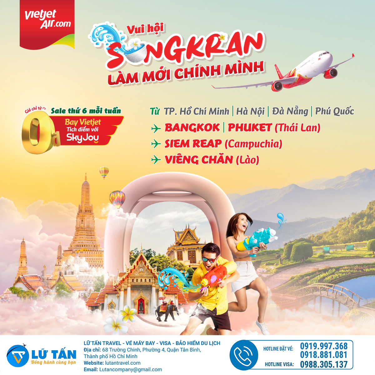 Lữ Tấn travel thường xuyên cập nhật thông tin giá vé và các ưu đãi giúp hành khách có thể dễ dàng chọn được hành trình bay phù hợp. Với nhiều năm kinh nghiệm cung cấp vé máy bay giá rẻ, đội ngũ tư vấn chuyên nghiệp, Lữ Tấn Travel tự tin khi đồng hành cùng bạn trong hành trình Nội địa và Quốc Tế. Liên hệ hotline 0919.997.368 - 0918.881.081 ngay hôm nay để các booker hướng dẫn và hỗ trợ bạn săn vé máy bay sớm nhất nhé!
